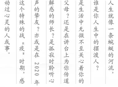 我們雖然是作文大賽,但是我想提醒大家,它不單單是一篇作文。作文的背后是我們對這個社會、對人生、對自己發(fā)展的思考。在新冠疫情肆虐全球的背景下,我們更值得去思考一下,誰是抗擊疫情的“擺渡人”,誰是世界的“擺渡人”,誰是中國的“擺渡人”。其實我們每一個人都可以成為抗擊疫情的“擺渡人”。