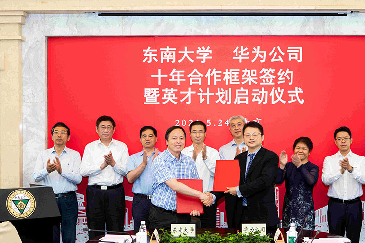 5月24日上午,東南大學-華為十年合作框架簽約暨英才計劃啟動儀式在東南大學四牌樓校區(qū)舉行。這是繼2020年華為公司CEO任正非來訪東南大學之后,雙方在戰(zhàn)略層面進行的重要合作。華為公司董事、戰(zhàn)略研究院院長徐文偉,華為人力資源副總裁曾凡麗、華為全球技術合作副總裁艾超、上海海思總裁熊偉、華為南京研究所所長郭坤、華為海思技術規(guī)劃部長王志敏、華為2012無線技術實驗室執(zhí)行主任盧建民;東南大學校長、中國工程院院士張廣軍,中國科學院院士崔鐵軍,東南大學常務副校長王保平,東南大學副校長丁輝、黃大衛(wèi)、金保昇以及華為公司和東南大學相關部門、學院負責人出席儀式,簽約儀式由丁輝主持。