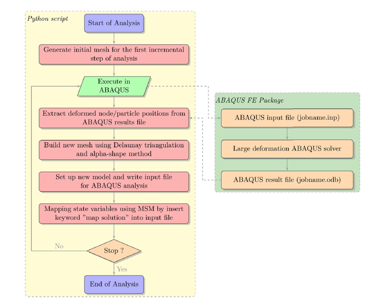 粒子有限元法將有限元網(wǎng)格中的節(jié)點視為自由粒子,根據(jù)分析步的位移增量更新粒子的位置,并通過周期性的計算域重新識別和網(wǎng)格重新剖分解決傳統(tǒng)有限元法存在的網(wǎng)格扭曲問題,能有效的實現(xiàn)巖土大變形數(shù)值模擬。研究采用Abaqus的內(nèi)置函數(shù)進(jìn)行常規(guī)增量FEM分析,并使用mesh-to-mesh mapping方法實現(xiàn)場變量的映射,使用單個Python腳本就能實現(xiàn)PFEM數(shù)值模擬,顯著減少了編碼工作量,為PFEM在巖土工程中的推廣應(yīng)用奠定了基礎(chǔ)。