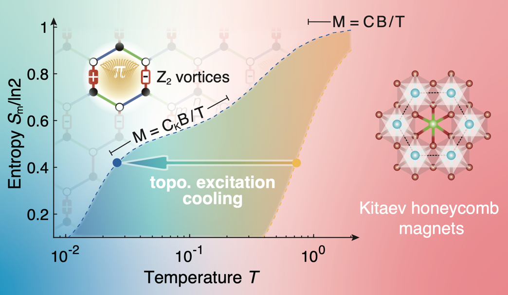 阻挫量子磁體通常具備較高的磁性離子密度、強(qiáng)烈的自旋漲落以及磁激發(fā)帶來的增強(qiáng)熱導(dǎo)等,并且材料結(jié)構(gòu)穩(wěn)定,可作為新型的磁制冷工質(zhì),有望實(shí)現(xiàn)極低溫的固態(tài)制冷。吉塔耶夫量子自旋液體由于阻挫效應(yīng)與量子漲落的共同作用,即便在遠(yuǎn)低于相互作用能標(biāo)的低溫甚至零溫時(shí)也不會(huì)形成磁有序,其低能拓?fù)浼ぐl(fā)會(huì)攜帶巨大的低溫熵,通過外場(chǎng)的有效調(diào)控能夠?qū)崿F(xiàn)顯著的磁卡效應(yīng),進(jìn)而實(shí)現(xiàn)拓?fù)浼ぐl(fā)極低溫制冷,這為探索新型固態(tài)制冷機(jī)制開辟了一條新途徑。