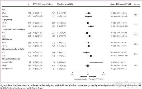 研究結(jié)果顯示,試驗(yàn)組和安慰劑組在90天UW-mRS的平均值上所差無幾,各項(xiàng)敏感性分析結(jié)果均一致,在亞組分析上,治療效果在血腫體積和血腫位置方面展現(xiàn)出了顯著異質(zhì)性。