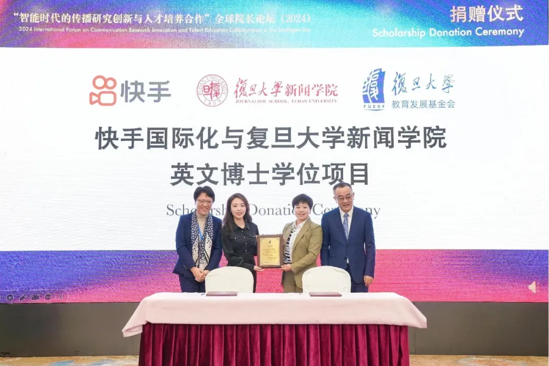 11月24日,由復旦大學新聞學院主辦的“智能時代的傳播研究創(chuàng)新與人才培養(yǎng)合作”全球院長論壇在復旦大學召開。論壇開幕式上舉行了快手國際化——復旦大學新聞學院英文博士項目獎學金捐贈儀式。復旦大學對外聯(lián)絡與發(fā)展處副處長、上海復旦大學教育發(fā)展基金會副秘書長林晶晶向快手國際化事業(yè)部人力資源高級總監(jiān)徐康楠頒發(fā)捐贈牌。