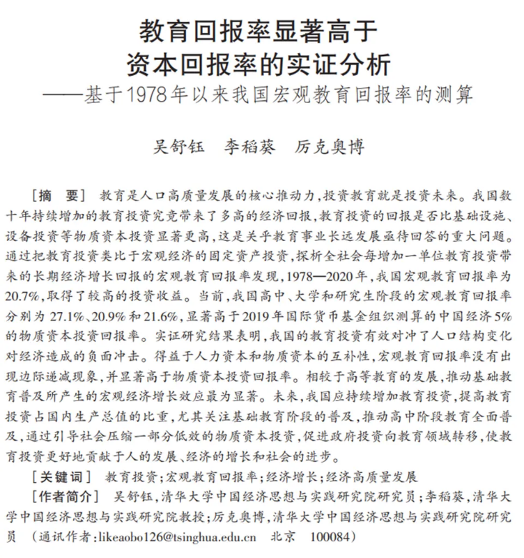 成果名稱:教育回報(bào)率顯著高于資本回報(bào)率的實(shí)證分析——基于1978年以來(lái)我國(guó)宏觀教育回報(bào)率的測(cè)算