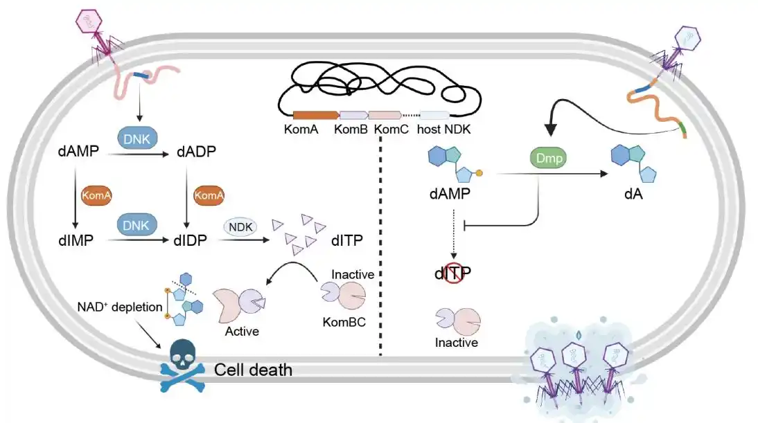在微觀世界里,細(xì)菌與病毒之間每天都在上演著攻防大戰(zhàn)。生物體內(nèi)的信號傳遞如同精密的通信網(wǎng)絡(luò),而核苷酸分子長期被認(rèn)為是關(guān)鍵的“信號兵”。自1950年代發(fā)現(xiàn)環(huán)狀核苷酸(如cAMP、cGMP)以來,科學(xué)家已解析了其在代謝調(diào)節(jié)、免疫應(yīng)答中的核心作用,相關(guān)研究多次獲得諾貝爾獎。不同于環(huán)狀核苷酸的免疫作用,非典型核苷酸在過去普通被認(rèn)為不發(fā)揮任何生理作用。然而,研究團(tuán)隊(duì)通過基因分析,鎖定了一個由KomA(孔明A)、KomB(孔明B)、KomC(孔明C)三個蛋白組成的防御系統(tǒng)。當(dāng)噬菌體入侵時,其攜帶的脫氧核苷酸激酶(DNK)意外成為激活細(xì)菌免疫的“開關(guān)”:KomA與DNK協(xié)作,將核苷酸(dAMP)轉(zhuǎn)化為特殊信號分子dITP。這種分子能觸發(fā)KomC蛋白分解細(xì)胞內(nèi)的關(guān)鍵物質(zhì)NAD?,導(dǎo)致噬菌體因“能源枯竭”無法復(fù)制。令人稱奇的是,該系統(tǒng)巧妙利用入侵者攜帶的酶完成防御,正如三國時期諸葛亮“草船借箭”的智謀,因此被命名為“孔明系統(tǒng)”。這種堿基修飾核苷酸的信號傳導(dǎo)模式突破了環(huán)狀核苷酸作為信號分子的經(jīng)典理論體系,首次證實(shí)非典型核苷酸同樣具有免疫調(diào)控功能。