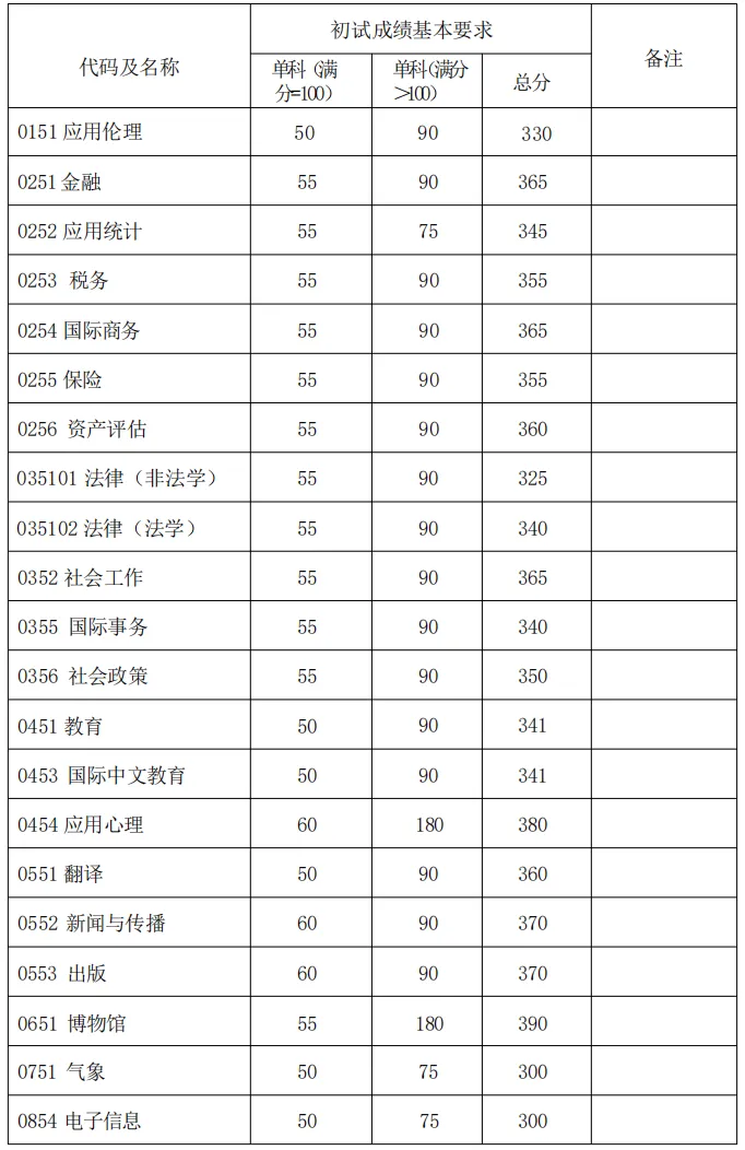 其中面向西藏地區(qū)“公共管理人才培養(yǎng)計(jì)劃”專項(xiàng),滿分100分的單科成績不低于40分、滿分200分的單科成績不低于90分、總分不低于160分;面向新疆喀什地區(qū)醫(yī)學(xué)碩士專項(xiàng),總分不低于235分,各單科成績不作要求。