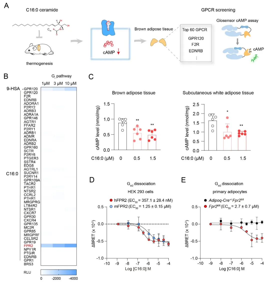 神經(jīng)酰胺作為鞘磷脂代謝核心分子,其異常累積與糖尿病、肥胖及動脈粥樣硬化等代謝疾病密切相關(guān)。研究團隊發(fā)現(xiàn)神經(jīng)酰胺可能通過一種Gi偶聯(lián)的GPCR調(diào)控脂肪產(chǎn)熱,利用GPCR高靈敏多通路信號檢測系統(tǒng),鑒定出FPR2是脂肪細胞中Gi偶聯(lián)的神經(jīng)酰胺受體。通過基因敲除和拮抗劑實驗證實C16:0神經(jīng)酰胺通過激活FPR2受體抑制脂肪產(chǎn)熱。