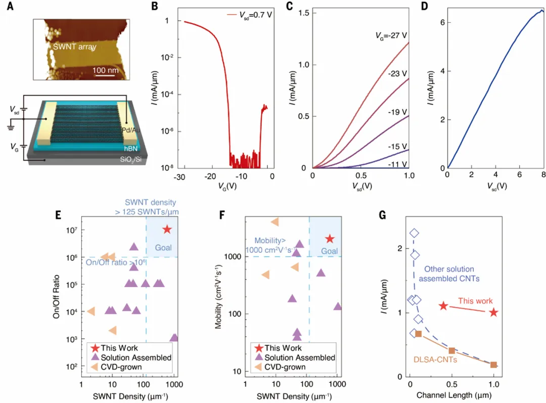 圖4 碳納米管陣列晶體管器件的優(yōu)異性能