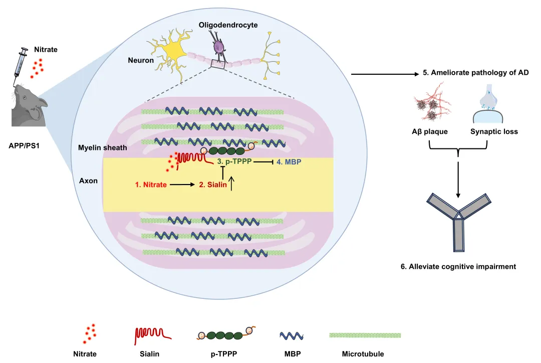 上述研究揭示了硝酸鹽通過上調(diào)神經(jīng)元Sialin,降低AD模型小鼠海馬TPPP的磷酸化,進(jìn)而改善其髓鞘丟失并緩解AD病理和認(rèn)知障礙,同時(shí)闡明Sialin與TPPP結(jié)合的具體位點(diǎn),該研究為AD治療靶點(diǎn)和治療策略的開發(fā)提供重要理論依據(jù)。