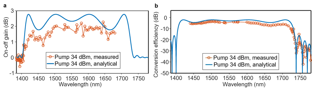 基于以上重大挑戰(zhàn),趙平團隊提出基于“脊形減模+彎曲濾?!奔夹g(shù)的單模、負色散非線性集成光波導(dǎo)設(shè)計普適性方法,原理上消除了過往參量放大非線性多模集成光波導(dǎo)中的隨機模式串擾。團隊以超低損耗非線性氮化硅集成平臺為例,制備出具有平坦傳輸光譜的、單模負色散非線性集成光波導(dǎo)芯片,如圖1所示。團隊還進一步發(fā)展了非線性氮化硅集成光波導(dǎo)中模電模式基模(TE00)二階與四階色散精確協(xié)同調(diào)控技術(shù),實驗中實現(xiàn)了帶寬高達330nm的片上光參量放大,如圖2所示。該項研究為新一代超大帶寬光放大提供了新思路,在提升光纖/無線光通信容量,擴大數(shù)據(jù)中心光互連規(guī)模,提高光學(xué)測量精度,拓展光譜檢測分析范圍等方面有良好的應(yīng)用潛力。