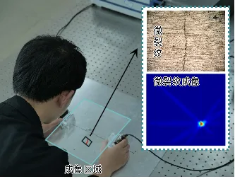 基于非線性超聲的金屬結(jié)構(gòu)近表面微裂紋成像(實(shí)驗(yàn)人員在隔振平臺(tái)上進(jìn)行實(shí)驗(yàn),檢測(cè)對(duì)象的近表面含有微米級(jí)的微裂紋。如圖所示,操作人員手里拿著兩個(gè)傳感器,形成一條檢測(cè)路徑,一個(gè)作為激勵(lì)端,通過(guò)振動(dòng)產(chǎn)生超聲信號(hào),另一個(gè)作為接收端,用來(lái)接收超聲信號(hào)。檢測(cè)路徑上如果存在損傷,接收信號(hào)的非線性成分會(huì)增加,通過(guò)對(duì)比檢測(cè)路徑健康狀況和損傷狀況下接收信號(hào)中的非線性成分,就可以知道路徑上是否存在損傷。通過(guò)布置多條路徑,路徑間就像蜘蛛網(wǎng)一樣交織在一起,形成多個(gè)交點(diǎn),經(jīng)過(guò)損傷的路徑會(huì)高亮顯示,他們的交點(diǎn)就是損傷存在的位置。成像結(jié)果展示出非線性超聲可以檢測(cè)出金屬板近表面的微裂紋損傷。)