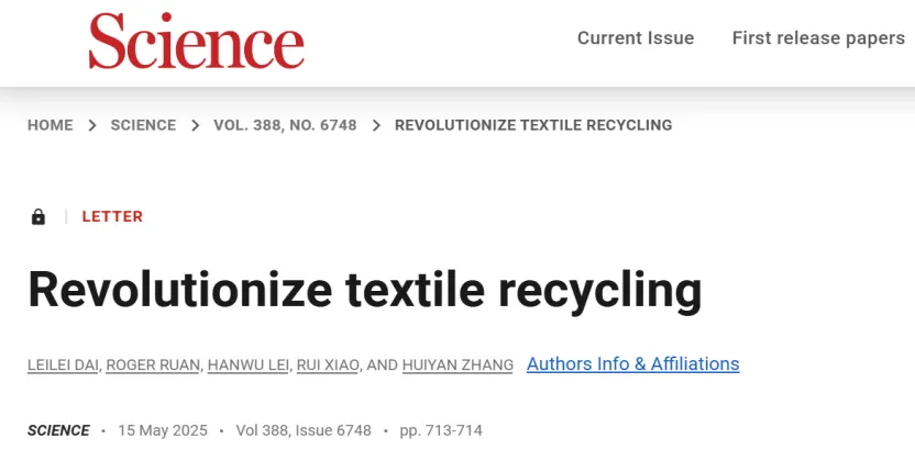 東南大學(xué)能源與環(huán)境學(xué)院肖睿教授、張會(huì)巖教授領(lǐng)銜的綠色能源團(tuán)隊(duì)在國(guó)際頂尖學(xué)術(shù)期刊《科學(xué)》(Science)上發(fā)表了題為 “Revolutionize textile recycling(革新廢紡回收)” 的 Letter 文章,針對(duì)全球日益嚴(yán)峻的廢紡等高分子固廢問(wèn)題,提出了創(chuàng)新性的見(jiàn)解與解決方案,呼吁通過(guò)跨學(xué)科、跨地域協(xié)同創(chuàng)新,構(gòu)建高效、綠色的高分子固廢回收定向熱轉(zhuǎn)化新范式。