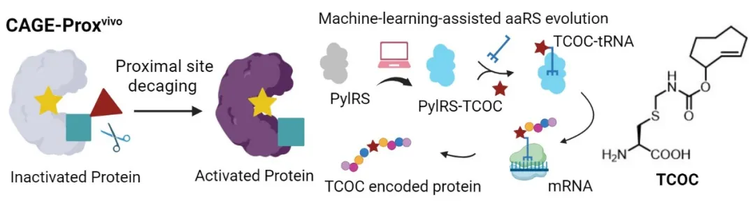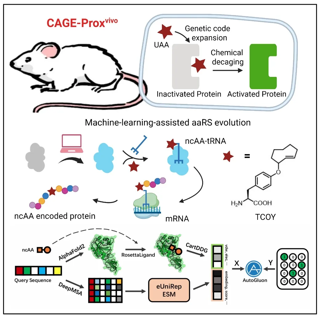 機(jī)器學(xué)習(xí)驅(qū)動(dòng)的蛋白質(zhì)活體激活策略:通過蛋白語言模型訓(xùn)練機(jī)器學(xué)習(xí)算法,設(shè)計(jì)和篩選tRNA合成酶(PylRS)變體,實(shí)現(xiàn)了可化學(xué)脫籠的反式環(huán)辛烯-酪氨酸(TCOY)的識(shí)別和編碼表達(dá),用于后續(xù)在體蛋白質(zhì)功能激活和互作調(diào)控
