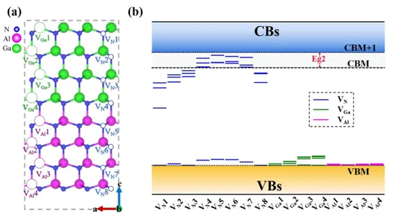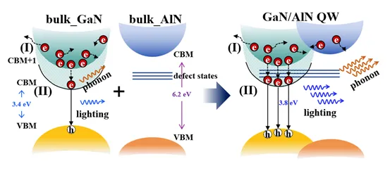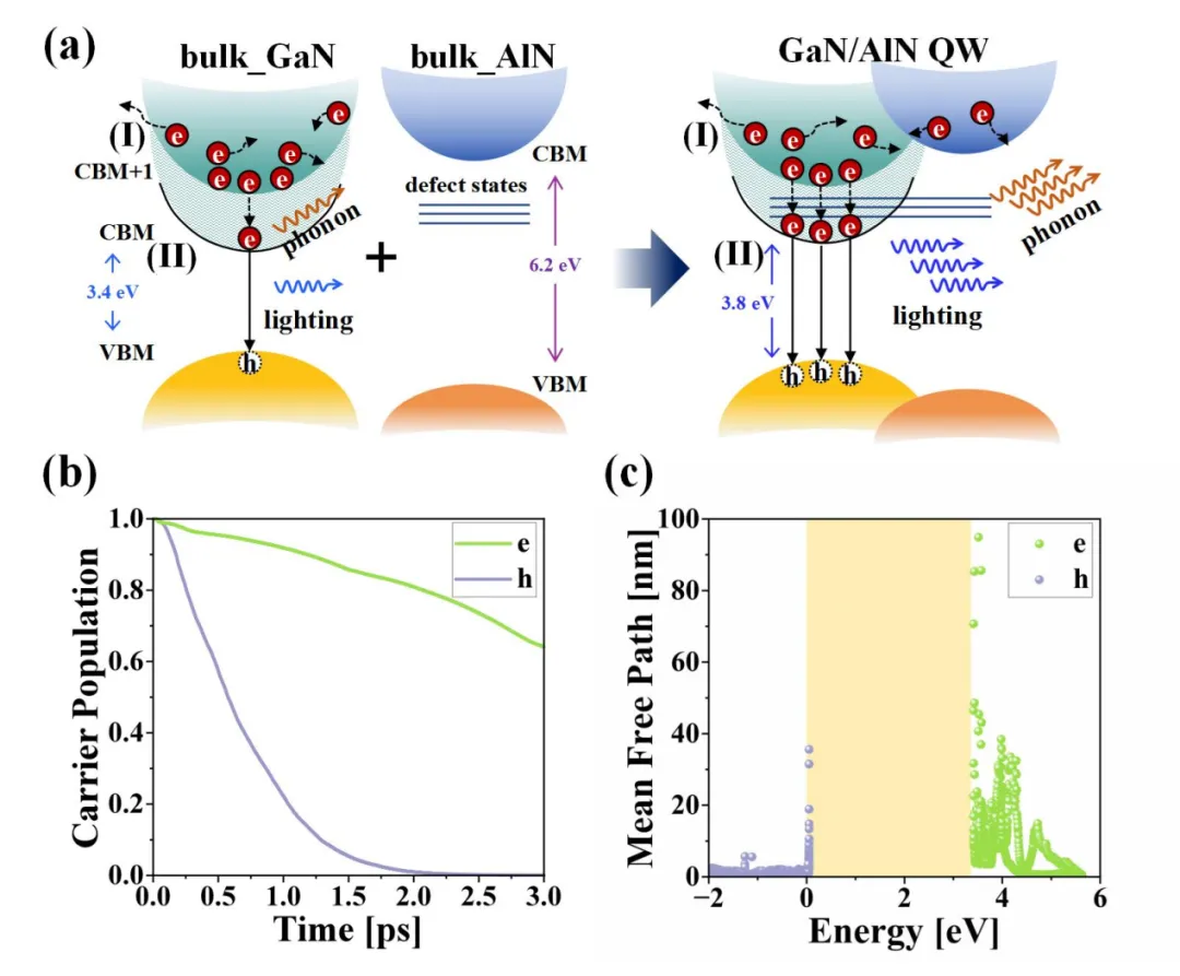 魏蘇淮教授和石芝銘、孫曉娟、黎大兵研究員團(tuán)隊(duì)基于對(duì)氮化物能帶結(jié)構(gòu)和載流子動(dòng)力學(xué)的分析,首次提出通過調(diào)控GaN/AlN量子阱界面的氮空位缺陷,實(shí)現(xiàn)對(duì)電子冷卻速率的有效增強(qiáng)。這些缺陷狀態(tài)作為中間能級(jí),能夠顯著加強(qiáng)電子-聲子相互作用,從而加速電子向?qū)У桌鋮s。第一性原理計(jì)算表明,該策略可使電子冷卻時(shí)間縮短超過一個(gè)數(shù)量級(jí),有效實(shí)現(xiàn)與空穴冷卻速率的動(dòng)態(tài)平衡,大幅提升發(fā)光效率。與傳統(tǒng)EBL結(jié)構(gòu)相比,該方法無需額外結(jié)構(gòu)設(shè)計(jì),即可實(shí)現(xiàn)電子動(dòng)力學(xué)的精準(zhǔn)調(diào)控。該研究還進(jìn)一步拓展了半導(dǎo)體缺陷物理的研究邊界,系統(tǒng)驗(yàn)證了缺陷在調(diào)控器件性能方面的“有益性”作用,顛覆了缺陷是有害的傳統(tǒng)認(rèn)知,為新一代電子與光電子器件的缺陷工程設(shè)計(jì)提供了理論支撐和新思路。