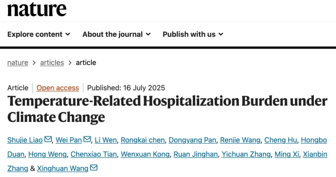 北京時(shí)間7月16日,Nature在線發(fā)表了武漢大學(xué)王行環(huán)教授團(tuán)隊(duì)關(guān)于氣候變化背景下與溫度相關(guān)的住院負(fù)擔(dān)的最新研究成果,論文題為“Temperature-Related Hospitalization Burden under Climate Change”。論文第一完成單位為武漢大學(xué)。
