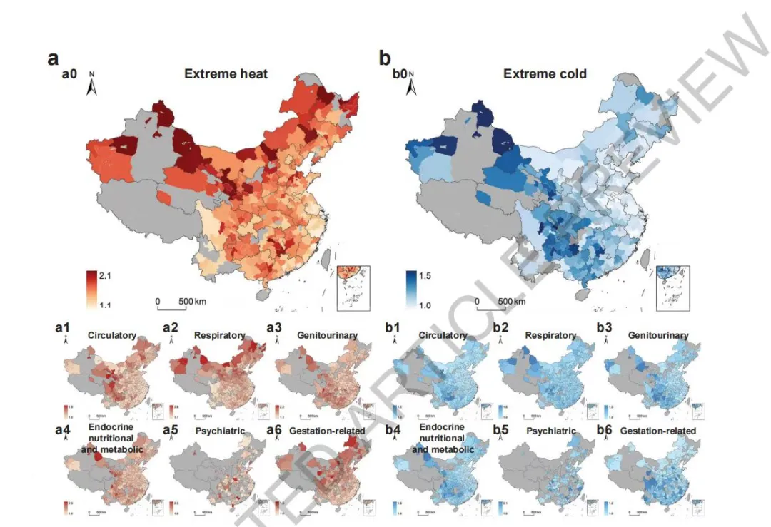 ▲溫度對(duì)醫(yī)院住院的影響(a、b)極端高溫(a)和極端低溫(b)對(duì) 中國(guó)城市在 95%和 5%氣溫百分位數(shù)下的醫(yī)院住院的相對(duì)風(fēng)險(xiǎn)。島狀區(qū)域被劃為南中國(guó)海島嶼?;A(chǔ)地圖的數(shù)據(jù)來源于中國(guó)自然資源部監(jiān)管的標(biāo)準(zhǔn)地圖服務(wù)平臺(tái)(http://bzdt.ch.mnr.gov.cn )。基礎(chǔ)地圖的批準(zhǔn)編號(hào)為 2023(2767)。地圖上的灰色區(qū)域表示無數(shù)據(jù)的區(qū)域。
