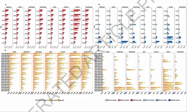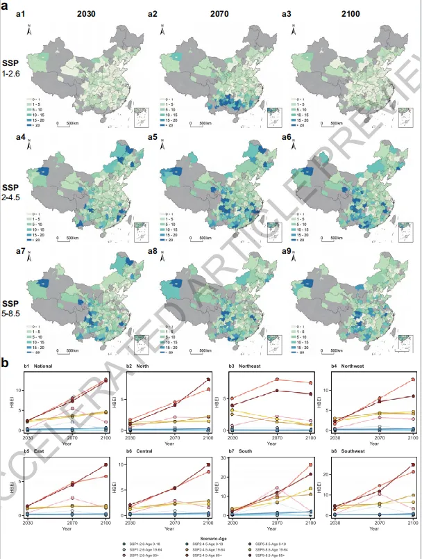 ▲未來與高溫相關(guān)的住院醫(yī)療負(fù)擔(dān)(a)2030年、2070年和2100年中國(guó)高溫相關(guān)住院經(jīng)濟(jì)負(fù)擔(dān)指數(shù)(HBEI),反映因城市極端高溫導(dǎo)致的額外住院費(fèi)用占GDP的比例。地圖中灰色區(qū)域表示數(shù)據(jù)缺失的地區(qū)。(b)不同年齡組及各地區(qū)的高溫相關(guān)HBEI。