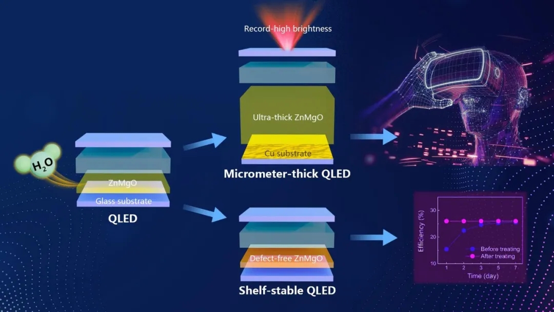 研究提出了水處理ZnMgO電子輸運(yùn)層的新方法,有效鈍化了ZnMgO的缺陷,并顯著提高了ZnMgO的導(dǎo)電性,實(shí)現(xiàn)了微米級(jí)厚度及發(fā)光穩(wěn)定的高性能QLED。