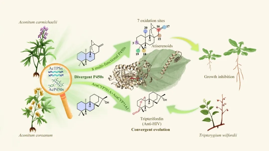 研究揭示了雷公藤福定生物合成在毛茛科黃花烏頭與衛(wèi)矛科雷公藤植物中的趨同進(jìn)化以及烏頭屬二萜的化感作用及其作為植物生長(zhǎng)調(diào)節(jié)劑的開(kāi)發(fā)應(yīng)用潛力,為烏頭屬植物復(fù)雜結(jié)構(gòu)二萜生物堿的下游生物合成通路解析奠定了基礎(chǔ)。