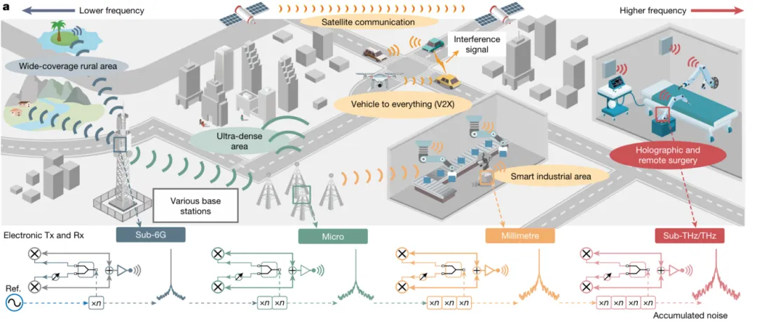 進(jìn)一步,得益于光電融合集成的可調(diào)諧特性,該系統(tǒng)支持工作頻率的實(shí)時(shí)重構(gòu)。即使在信道受噪聲干擾或多徑效應(yīng)等被動(dòng)影響而劣化時(shí),仍能通過動(dòng)態(tài)切換至安全頻段確保通信可靠性。以萬(wàn)人聚集的演唱會(huì)、體育賽事等場(chǎng)景為例,傳統(tǒng)無(wú)線設(shè)備往往采用相同且固定的頻率,導(dǎo)致用戶之間相互干擾,網(wǎng)絡(luò)體驗(yàn)大打折扣。而該技術(shù)則如同搭建了一條“寬闊的高速公路”。在其賦能下,周圍基站與用戶手機(jī)能夠智能地在不同頻段間進(jìn)行切換以實(shí)現(xiàn)通信。每一臺(tái)用戶設(shè)備都能找到“專屬通道”,自由且高效地選擇不擁堵、通暢的頻段開展通信,有效避免了信號(hào)擁堵和干擾問題,極大提升了通信質(zhì)量與效率。