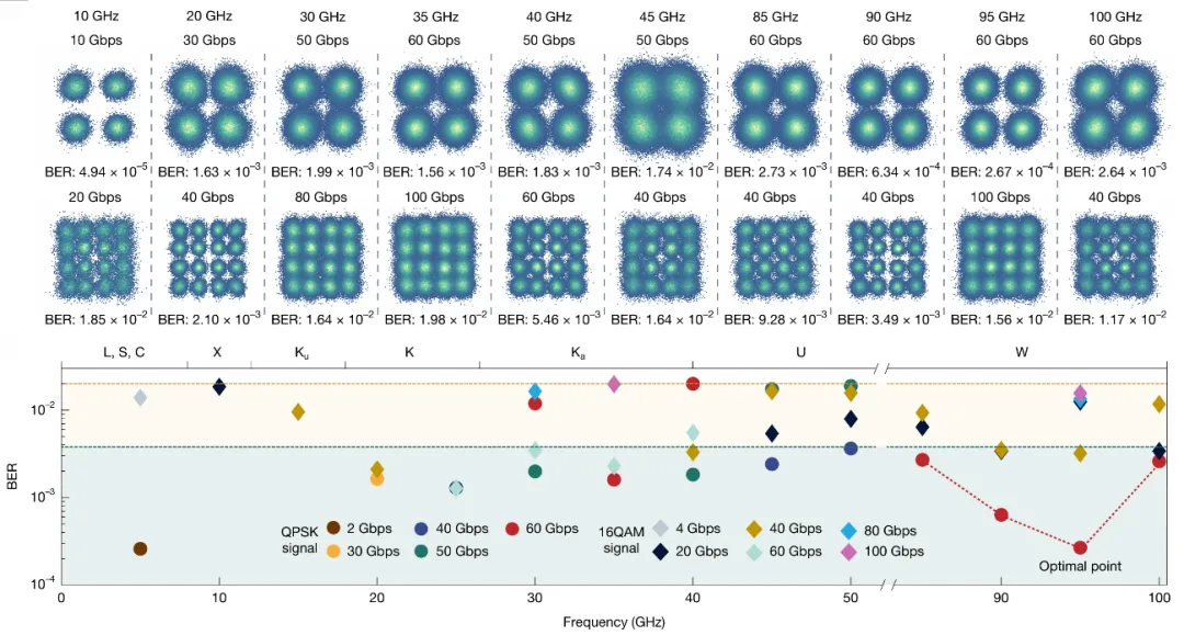 團(tuán)隊(duì)的實(shí)驗(yàn)驗(yàn)證表明,該系統(tǒng)可實(shí)現(xiàn)>120 Gbps的超高速無(wú)線傳輸速率,滿足6G通信的峰值速率要求。尤為關(guān)鍵的是,得益于光電融合集成芯片的超寬帶特性,端到端無(wú)線通信鏈路在全頻段內(nèi)展現(xiàn)出卓越的性能一致性,且高頻段性能未見劣化。這一突破性成果為6G通信高效開發(fā)太赫茲及乃至更高頻段的頻譜資源掃清了關(guān)鍵障礙。