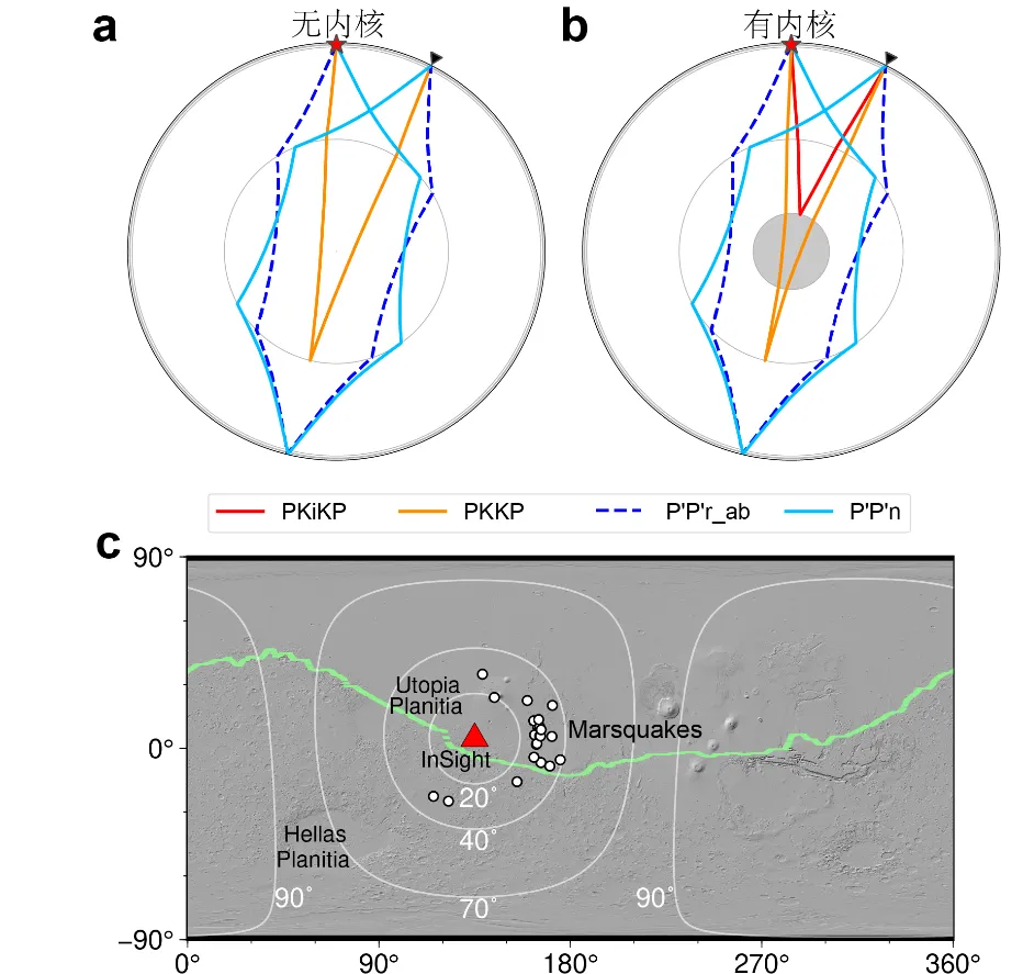 為突破這一挑戰(zhàn),研究團(tuán)隊(duì)創(chuàng)新性地引入火震陣列分析方法,通過(guò)對(duì)23個(gè)信噪比較高的火震事件數(shù)據(jù)的分析,成功提取出穿過(guò)火星核的關(guān)鍵震相,如在地表反射的PKPPKP(P'P')和在核幔邊界反射的PKKP(下圖a)。特別值得注意的是,實(shí)際觀測(cè)到的PKKP到時(shí),較當(dāng)前僅考慮液態(tài)核的火星速度模型所預(yù)測(cè)的結(jié)果提前了50至200秒。地震波在固體中的傳播速度比在液體中快。因此,這一差異表明,火星核具有分層結(jié)構(gòu):即外層為液態(tài)核,而更深部則存在一個(gè)波速更高的固態(tài)內(nèi)核。