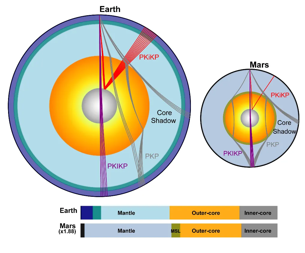 在進(jìn)一步分析中,研究團(tuán)隊(duì)首次在火震數(shù)據(jù)中識(shí)別出被視為“固態(tài)內(nèi)核標(biāo)志”的 PKiKP 震相信號(hào)(上圖b)。這一發(fā)現(xiàn)為火星存在固態(tài)內(nèi)核提供了證據(jù)。結(jié)合不同火核震相,團(tuán)隊(duì)測(cè)得火星固態(tài)內(nèi)核半徑約 600 公里,占火星半徑的 1/5(下圖)。如將火星按比例放大至地球大小,其內(nèi)外核結(jié)構(gòu)比例與地球高度接近(下圖)。
