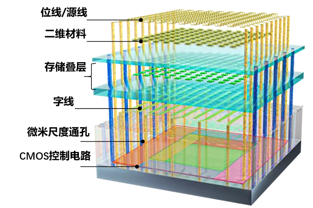 二維-硅基混合架構閃存芯片結構示意圖,包含二維模塊、CMOS控制電路和微米尺度通孔