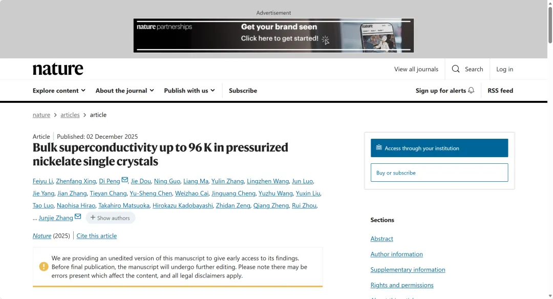 近日,山東大學(xué)晶體材料全國(guó)重點(diǎn)實(shí)驗(yàn)室張俊杰教授/陶緒堂教授團(tuán)隊(duì)牽頭,聯(lián)合北京高壓研究中心曾橋石研究員、中國(guó)科學(xué)院物理研究所周睿研究員、國(guó)家納米科學(xué)中心鄭強(qiáng)研究員、芝加哥大學(xué)陳愈生教授等多個(gè)團(tuán)隊(duì),在鎳基高溫超導(dǎo)體研究中取得重大突破,相關(guān)團(tuán)隊(duì)以“Bulk superconductivity up to 96 K in pressurized nickelate single crystals”為題,在線發(fā)表于國(guó)際頂級(jí)期刊《自然》(Nature)上。