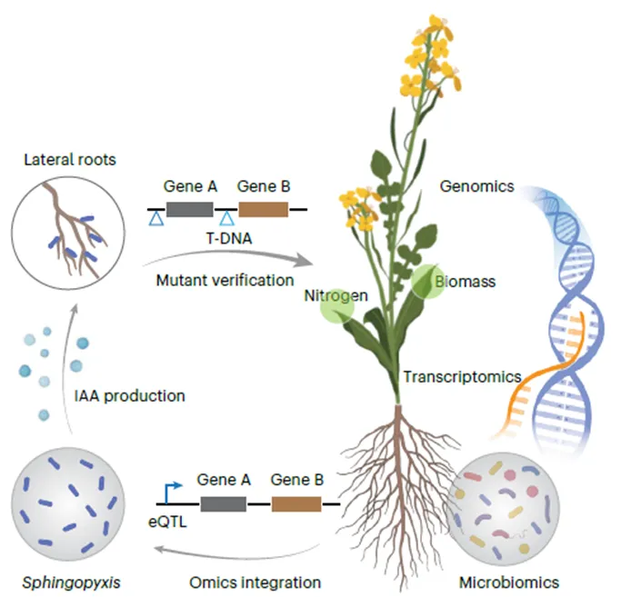 課題組選取了175份具有廣泛遺傳多樣性的甘藍(lán)型油菜種質(zhì),在兩個(gè)典型田間環(huán)境下系統(tǒng)調(diào)查了根系轉(zhuǎn)錄組、根際細(xì)菌16S rRNA譜和植株離子組,構(gòu)建了1341組配對(duì)多組學(xué)數(shù)據(jù)集。通過(guò)全基因組關(guān)聯(lián)分析、轉(zhuǎn)錄組關(guān)聯(lián)分析與表達(dá)數(shù)量性狀位點(diǎn)定位,鑒定出203個(gè)具有中高遺傳力的細(xì)菌擴(kuò)增子序列變異,其中多個(gè)ASV與根系氮含量顯著相關(guān)。尤為重要的是,宿主轉(zhuǎn)錄組與微生物組數(shù)據(jù)聯(lián)合解釋了高達(dá)45%的氮吸收自然變異。進(jìn)一步地,鎖定了受宿主強(qiáng)遺傳調(diào)控的關(guān)鍵細(xì)菌屬—鞘氨醇盒菌屬(Sphingopyxis)。通過(guò)高通量培養(yǎng)、全基因組測(cè)序與功能驗(yàn)證,證實(shí)該菌能通過(guò)合成生長(zhǎng)素(IAA)促進(jìn)油菜側(cè)根發(fā)育,從而增強(qiáng)低氮條件下的氮素獲取能力。