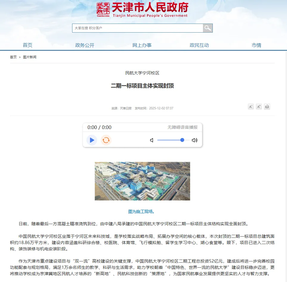 近期,據(jù)天津人民政府官網(wǎng)消息,中國民航大學(xué)寧河校區(qū)二期一標(biāo)項(xiàng)目主體結(jié)構(gòu)實(shí)現(xiàn)全面封頂。該工程總投資52億元,總建筑面積約18.86萬平方米。