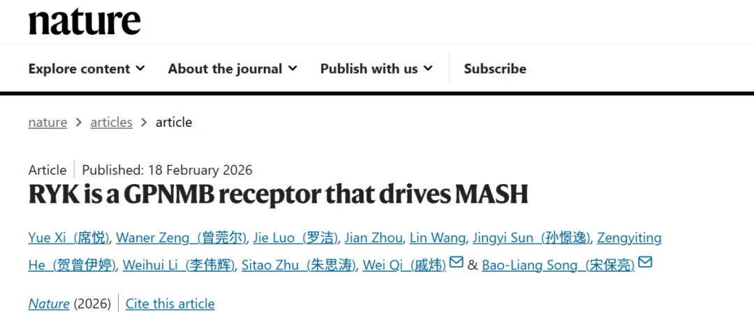 2月18日,武漢大學宋保亮院士團隊在《自然》(Nature)雜志發(fā)表題為“RYK is a GPNMB receptor that drives MASH”的研究論文。該研究發(fā)現(xiàn)GPNMB-RYK新型配體-受體途徑介導MASH的發(fā)生發(fā)展,揭示肝細胞脂代謝重編程關鍵調控分子GPNMB,通過蛋白酶切割,生成功能形式的分泌型GPNMB胞外域(G-ECD),并首次鑒定單次跨膜蛋白RYK為G-ECD的功能性受體,通過增強肝脂攝取和合成,最終驅動MASLD/MASH。靶向GPNMB-RYK信號軸的多種治療策略,包括G-ECD疫苗、中和抗體、AAV-shRNA、GalNAC-siRNA均能有效地預防或治療MASLD/MASH。武漢大學生命科學學院、泰康生命醫(yī)學中心博士后席悅為第一作者,武漢大學復雜生命體代謝與調控全國重點實驗室、泰康生命醫(yī)學中心主任宋保亮院士和上??萍即髮W教授戚煒為共同通訊作者。