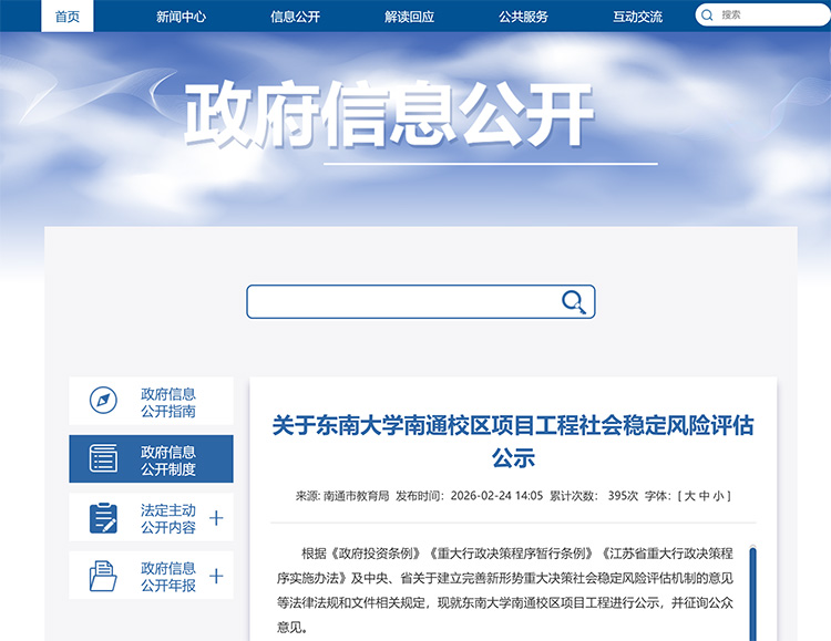 2月24日,江蘇南通市教育局官網(wǎng)發(fā)布《關(guān)于東南大學(xué)南通校區(qū)項目工程社會穩(wěn)定風(fēng)險評估公示》。公示信息顯示,東南大學(xué)南通校區(qū)選址位于南通市崇川區(qū)通富北路東,通滬大道北,崇川路南,觀山路西,總占地面積約1055畝,校舍總建筑面積約52.2萬㎡,地上約45.8萬㎡,地下約6.4萬㎡,建設(shè)期約36個月。