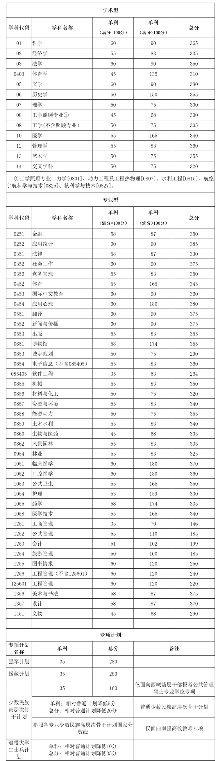 1、以上分數(shù)線為學(xué)校確定的進入復(fù)試的初試成績基本要求,是考生進入我校復(fù)試的最低要求,我校各學(xué)院(系/所)可根據(jù)招生計劃、生源情況等因素提高本單位進入復(fù)試的初試成績基本要求??忌芊襁M入復(fù)試以各學(xué)院(系/所)公布的進入復(fù)試的初試成績基本要求為準。