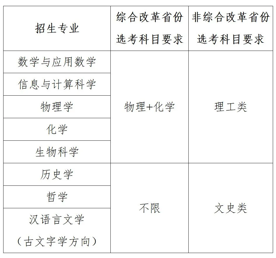 我校面向全國招生,符合2026年普通高等學(xué)校招生全國統(tǒng)一考試報(bào)名條件,綜合素質(zhì)優(yōu)秀或基礎(chǔ)學(xué)科拔尖,并有志于將來從事相關(guān)領(lǐng)域科研工作的高中畢業(yè)生均可申請(qǐng)報(bào)名。申請(qǐng)報(bào)名考生分為以下兩類: