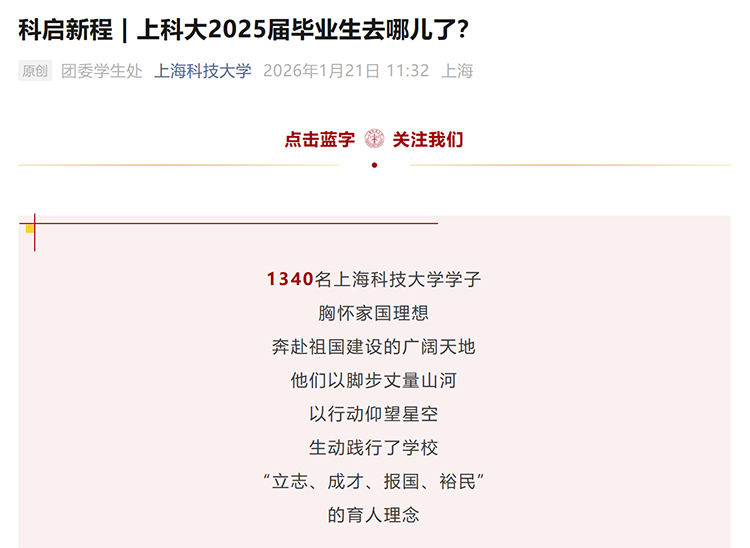 上??萍即髮W始終厚植就業(yè)創(chuàng)業(yè)沃土,為畢業(yè)生搭建成長平臺、提供全鏈條支持。2025屆畢業(yè)生中,有1名碩士生、2名博士生懷揣夢想投身創(chuàng)業(yè)實踐。