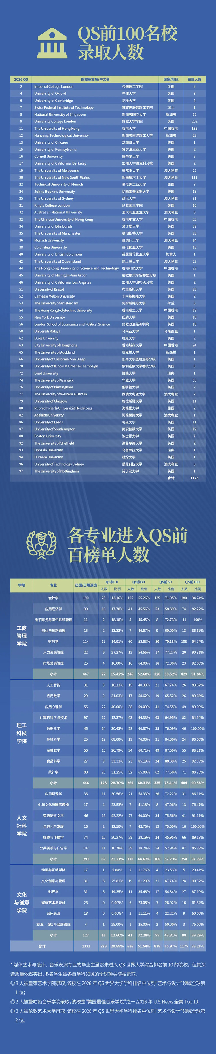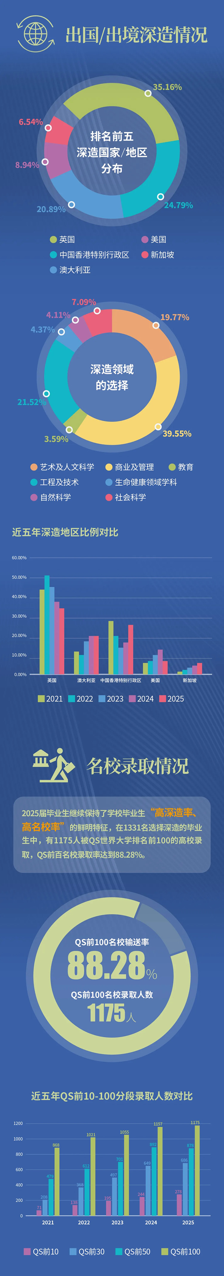 尤為亮眼的是升學(xué)質(zhì)量:在出國/出境深造的畢業(yè)生中,QS世界排名前10高校錄取比例首次突破20%;QS前100高校輸送率則高達(dá)88.28%,錄取人數(shù)持續(xù)攀升。同時(shí),入讀英國G5超級(jí)精英大學(xué)、新加坡兩所著名公立高校的人數(shù)均實(shí)現(xiàn)增長。
