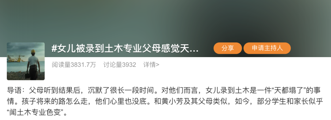 土木工程,又一次被推上風口浪尖。近日,#女兒被錄到土木專業(yè)父母感覺天塌了#的話題引發(fā)廣泛討論,迅速登上熱搜榜。