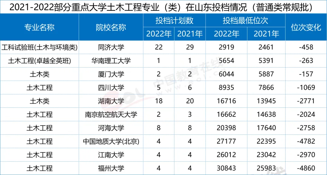 根據(jù)中國教育在線發(fā)布的《2023高招調(diào)查報告》,全國范圍大部分高校土木專業(yè)分數(shù)都出現(xiàn)了明顯的滑坡,錄取分數(shù)(位次)出現(xiàn)了不同程度的下跌。同濟大學在山東的錄取位次下跌了400多,中國地質(zhì)大學(北京)在招生總量未變的情況下,錄取考生的位次下跌了近5000個位次,四川大學與湖南大學則分別下跌1069和2771個位次。