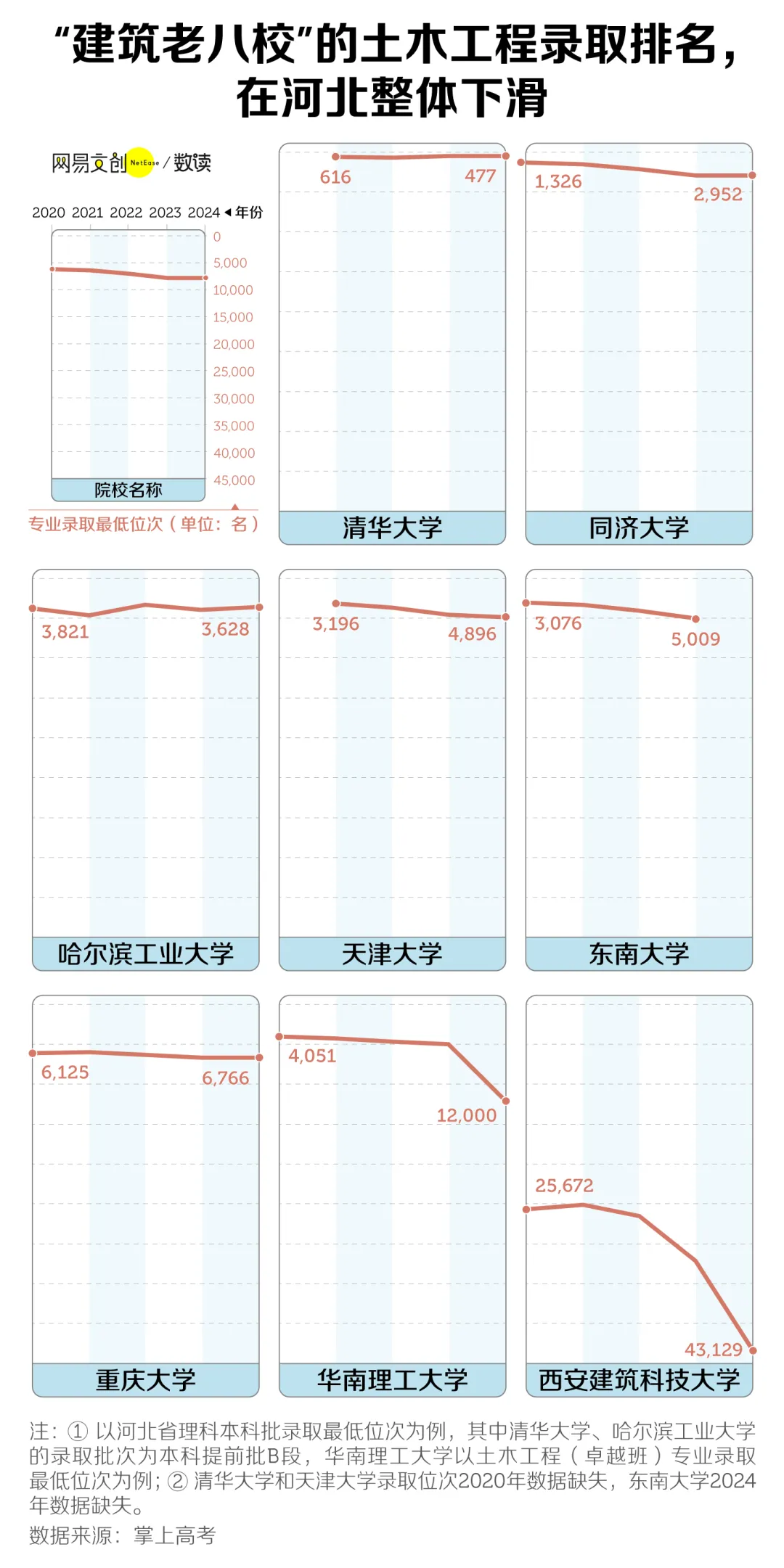 2020年以來,在土木業(yè)內(nèi)擁有重大影響力的“建筑老八?!痹诤颖钡母呖间浫≈校饲迦A大學、哈工大的最低錄取名次在“悶聲”回升外,其他學校的錄取位次大多有所下跌。相較往年,2024年華南理工大學在河北的最低錄取位次掉落了近七千名,西安建筑科技大學更是暴跌一萬多名。