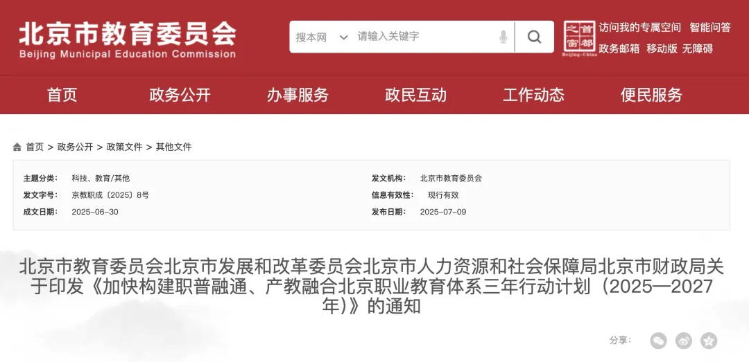 7月9日,北京市教育委員會網(wǎng)站發(fā)布《加快構建職普融通、產(chǎn)教融合北京職業(yè)教育體系三年行動計劃(2025—2027年)》,其中明確提出:支持高水平高校與職業(yè)院校探索高職專科、職業(yè)本科、專業(yè)碩士貫通培養(yǎng)高水平技能人才。