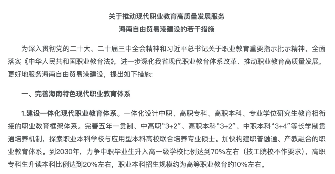 今年4月,海南省人民政府辦公廳印發(fā)的《關于推動現(xiàn)代職業(yè)教育高質(zhì)量發(fā)展服務海南自由貿(mào)易港建設的若干措施》中明確指出:建設一體化現(xiàn)代職業(yè)教育體系。一體化設計中職、高職專科、高職本科、專業(yè)學位研究生教育相銜接的職業(yè)教育框架體系。探索職業(yè)本科學校與應用型本科高校聯(lián)合培養(yǎng)專業(yè)碩士。