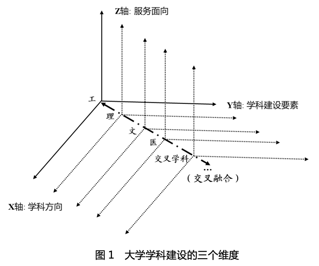 首先,可以用一張三維坐標圖把大學的內(nèi)涵和基礎關系展示出來。(見圖1)