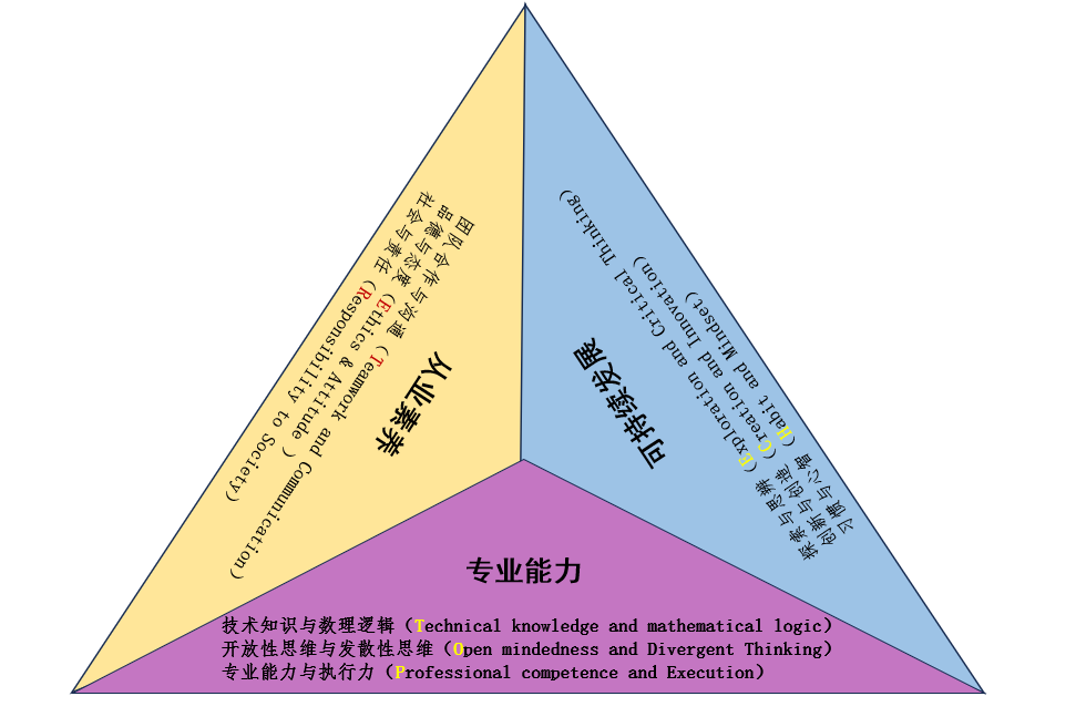 信息文明時代,我們應(yīng)該構(gòu)建了專業(yè)能力、從業(yè)素養(yǎng)和可持續(xù)發(fā)展“三棱錐”圖譜,圍繞知識探索、能力建設(shè)、人格塑造三要素構(gòu)建“TOPTECHER”核心能力模型。“三棱錐”中的專業(yè)能力主要包含以下三個指標(biāo):技術(shù)知識與數(shù)理邏輯(Technical knowledge and mathematical logic),開放性思維與發(fā)散性思維(Open mindedness and Divergent Thinking),專業(yè)能力與執(zhí)行力(Professional Competence and Execution);在從業(yè)素養(yǎng)中,我們應(yīng)該更加強(qiáng)調(diào)了學(xué)生與社會的溝通能力以及對社會的責(zé)任,從業(yè)素養(yǎng)包含了以下三個指標(biāo):團(tuán)隊合作和溝通(Teamwork and Communication),品德與態(tài)度(Ethics and Attitude),社會與責(zé)任(Responsibility to society);可持續(xù)發(fā)展能力包含了以下三個指標(biāo):探索與思辨(Exploration and Critic thinking), 創(chuàng)新與創(chuàng)造(Creation and Innovation),習(xí)慣與心智(Habit and Mindset)。在“三棱錐”模型中,專業(yè)能力為基礎(chǔ),筑牢事業(yè)發(fā)展的根基,從業(yè)素養(yǎng)為保障,規(guī)范職業(yè)行為的準(zhǔn)則,可持續(xù)發(fā)展是關(guān)鍵,開啟未來職場的通途。三者相互促進(jìn),相互影響,共同推動高等教育供給側(cè)從“學(xué)業(yè)”認(rèn)同向“就業(yè)”認(rèn)同轉(zhuǎn)變,從“學(xué)歷”認(rèn)同向“能力”認(rèn)同轉(zhuǎn)變,從“成長”認(rèn)同向“成才”認(rèn)同轉(zhuǎn)變。