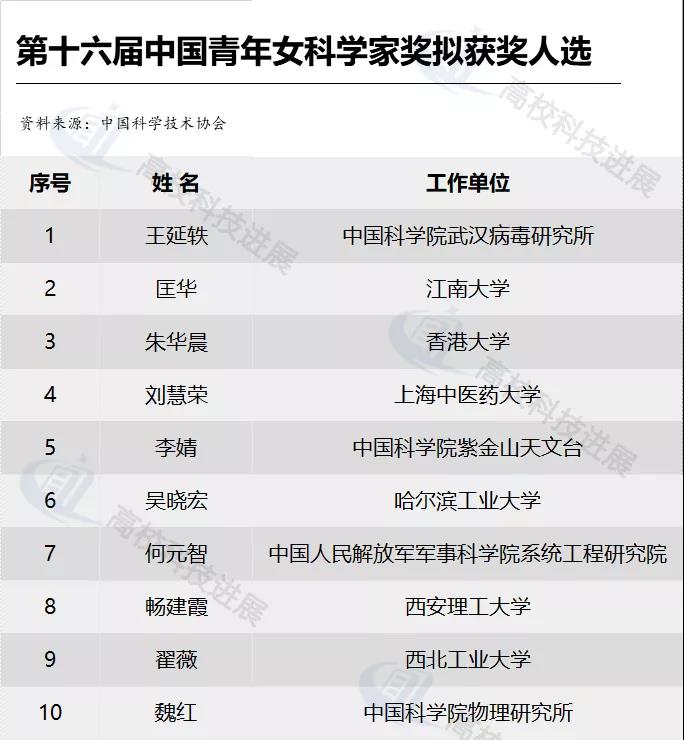 據(jù)中國科學(xué)技術(shù)協(xié)會(huì)官網(wǎng)日前對外公示的第十六屆中國青年女科學(xué)家獎(jiǎng)、2019年度未來女科學(xué)家計(jì)劃擬獲獎(jiǎng)名單顯示,本次共有9位高校女科學(xué)家,3個(gè)高校女科學(xué)家作為負(fù)責(zé)人的團(tuán)隊(duì)入圍擬獲獎(jiǎng)名單。