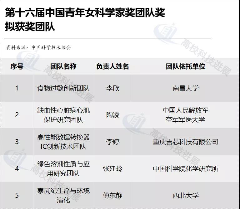 南昌大學(xué)、中國人民解放軍空軍軍醫(yī)大學(xué)和西北大學(xué),各有1個(gè)團(tuán)隊(duì)入圍第十六屆“中國青年女科學(xué)家獎(jiǎng)團(tuán)隊(duì)獎(jiǎng)”擬獲獎(jiǎng)團(tuán)隊(duì)。擬獲獎(jiǎng)團(tuán)隊(duì)分別為:以南昌大學(xué)李欣教授為負(fù)責(zé)人的食物過敏創(chuàng)新團(tuán)隊(duì)、以中國人民解放軍空軍軍醫(yī)大學(xué)陶凌教授為負(fù)責(zé)人的缺血性心臟病心肌保護(hù)研究團(tuán)隊(duì)、以西北大學(xué)傅東靜為負(fù)責(zé)人的寒武紀(jì)生命與環(huán)境演化團(tuán)隊(duì)。