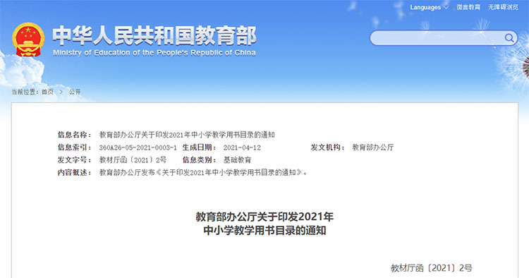 近日,教育部辦公廳發(fā)布《關(guān)于印發(fā)2021年中小學(xué)教學(xué)用書目錄的通知》,公布了2021年普通中小學(xué)、特殊教育學(xué)校和體育運(yùn)動學(xué)校教學(xué)用書目錄和用書要求。