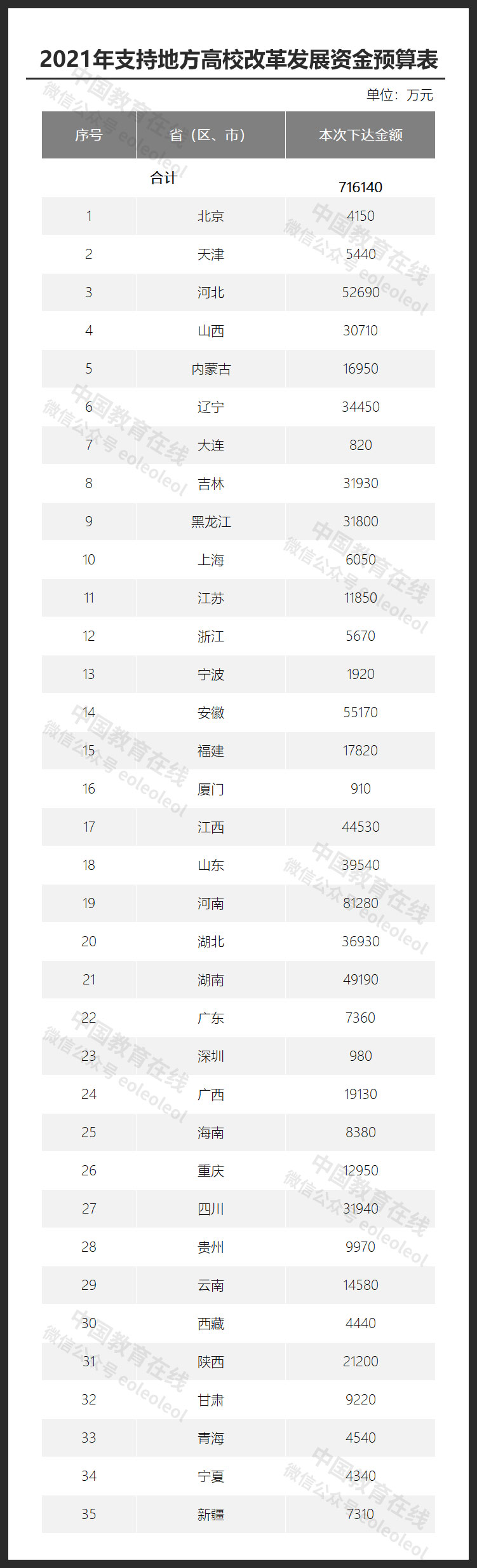 近日財(cái)政部、教育部聯(lián)合印發(fā)《關(guān)于下達(dá)2021年支持地方高校改革發(fā)展資金預(yù)算的通知》(以下簡(jiǎn)稱《通知》),為支持地方高校改革發(fā)展,本次向各省(自治區(qū)、直轄市、計(jì)劃單列市)下達(dá)資金預(yù)算合計(jì)71.6億元。
