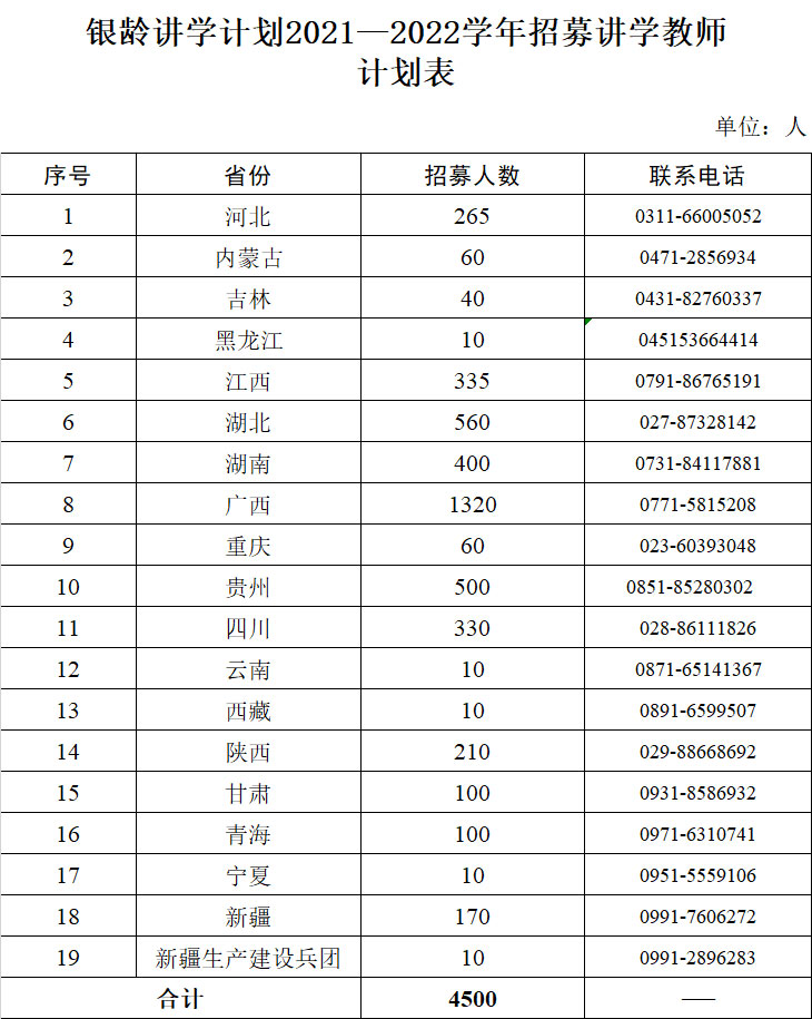2021年計劃招募4500名講學(xué)教師。申請銀齡講學(xué)計劃的退休教師以校長、教研員、特級教師、骨干教師為主。年齡一般在65(含)歲以下。講學(xué)教師原則上應(yīng)具有中級及以上教師職稱,以高級教師為主。原單位返聘退休教師工作不列入銀齡講學(xué)計劃。