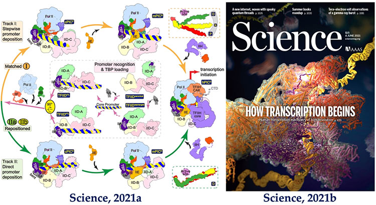 上述成果以2篇研究長文發(fā)表于《科學》雜志(Science 372, eaba8490;Science 372, eabg0635),其中一篇被Science雜志選為封面文章,題目為“轉錄如何起始”。