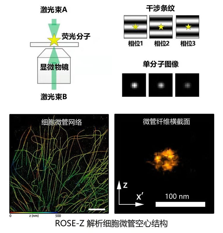 細胞的生理過程是由納米尺度的生物分子執(zhí)行的,因此對生命活動更深入的理解需要納米分辨率的成像技術。中國科學院生物物理研究所徐濤院士組和紀偉研究組組成的技術攻關團隊,一直聚焦于突破光學顯微成像分辨率的研究,前期發(fā)展的ROSE顯微鏡把側向(X-Y)分辨率提高到納米水平(Nature Methods,2019),基于干涉定位創(chuàng)新原理又研制出ROSE-Z顯微鏡,進一步突破了軸向(Z)分辨率,可解析納米尺度的亞細胞結構,為生命科學研究提供了有力工具。該研究表明光學顯微鏡已經(jīng)步入納米分辨率時代,我國科學家在該領域具備多學科交叉技術創(chuàng)新能力,研制的具有自主知識產(chǎn)權的新型超分辨成像設備處于國際領先地位。